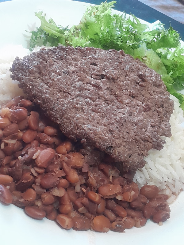 Meu almoço tá feio hoje mas tá bom, eu coloquei tanta carne no feijão que nem tinha espaço pro feijão kkkkkkkkk