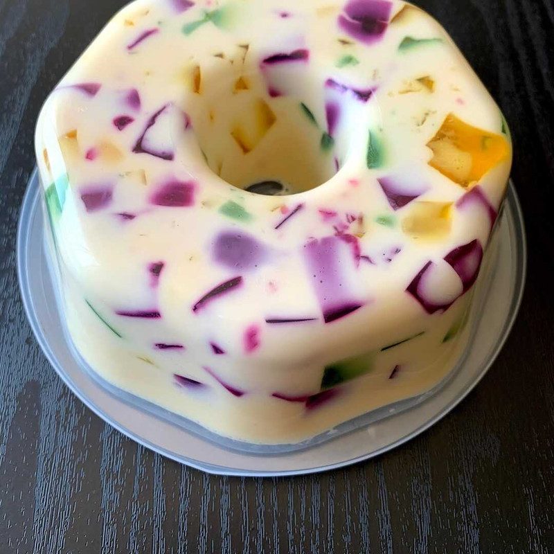 A Camila esse dia fez uma gelatina com frutas e leite condensado na forma de pudim tem que ver que coisa boa.