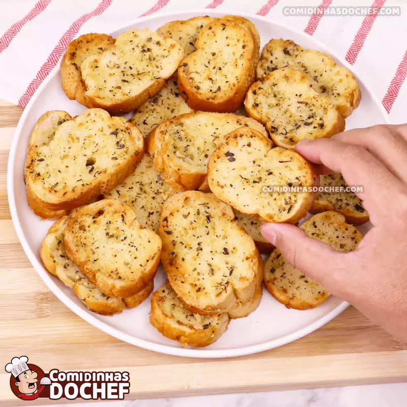 Azeite não, costumo cortar os pães em fatias, passar manteiga, colocar orégano e colocar para assar. Deixar torradinho.