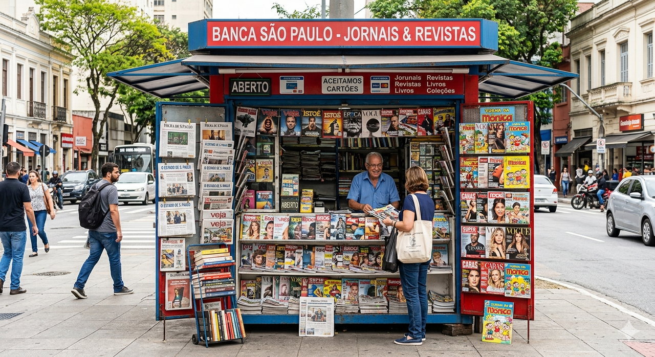 Agora com a facilidade da internet nas casas, ela derrubou as bancas de jornais, me recordo que ali na praça da Sé, era uma banca de jornal do lado da outra, tinha mais de 20 se não me engano, mas com a facilidade da internet ela destronou as bancas de jornais, orelhões, lan houses.
